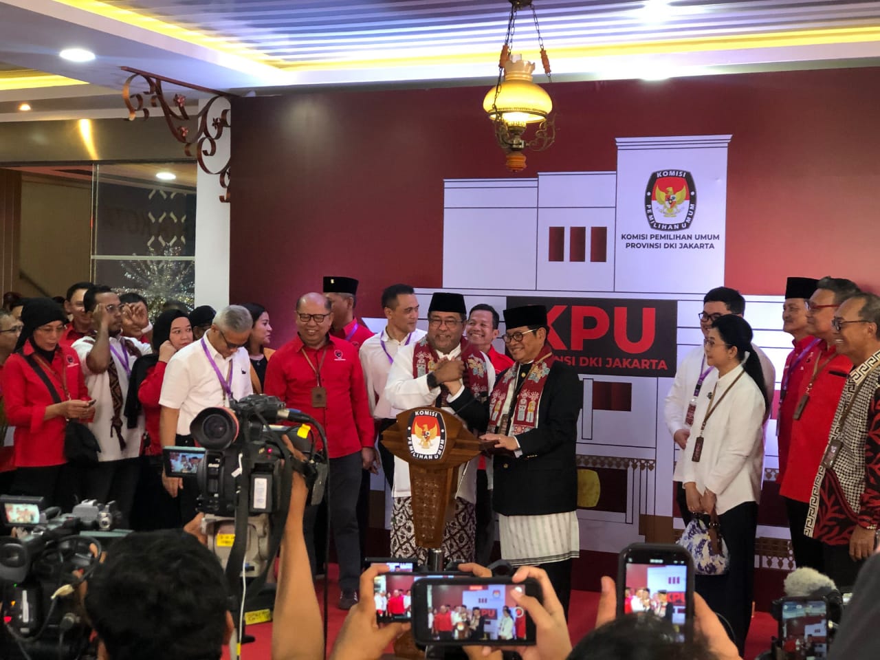 Pasangan calon ini tiba di KPUD sekitar pukul 11.10 WIB dengan menggunakan kendaraan resmi, diiringi oleh pertunjukan musik Tanjidor dan ondel-ondel, yang merupakan bagian dari budaya Betawi.