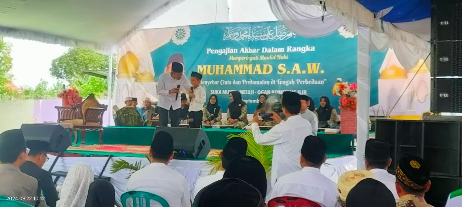 OKI, Sumsel9.com – Dalam rangka memperingati Maulid Nabi Muhammad SAW, masyarakat Desa Suka Mukti, Kecamatan Mesuji, Kabupaten Ogan Komering Ilir menggelar acara pengajian yang berlangsung khidmat Minggu (21/9). Acara ini dihadiri oleh tokoh agama, pejabat pemerintah, serta ratusan jamaah dari berbagai wilayah sekitar.
