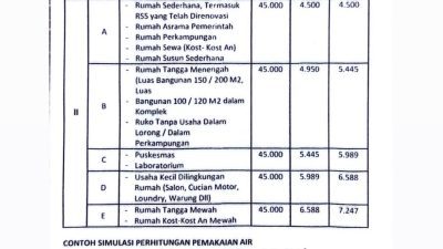 Penyesuaian tarif air untuk rumah tangga dengan beban 0 sampai 10 kubik Rp. 45.000 bila 11 Kubik per 1kubiknya Rp. 4.500 bila diatas 21 Kubik Rp. 4.500 dan untuk tarif rumah menengah dan ruko untuk beban dari 0 sampai 10 Kubik Rp 45.000, diatas 11 kubik Rp 4.950 dan diatas 21 Kubik Rp 5.445 puskesmas dan laboratorium 11 Kubik Rp 5.445 diatas 21 kubik Rp 5.989 niga kecil 11 kubik Rp 5. 989, 21 kubik Rp 6.588 dan untuk rumah mewah 11 Rp 6.588.untuk 21 kubik keatas Rp 7.242