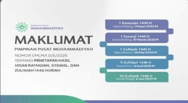 Pimpinan Pusat (PP) Muhammadiyah telah menetapkan bahwa 1 Ramadhan 1446 H jatuh pada Sabtu, 1 Maret 2025. Keputusan ini menggunakan metode hisab hakiki wujudul hilal, yang menghitung posisi bulan untuk memastikan awal bulan baru. Dengan metode ini, Muhammadiyah telah menentukan tanggal awal puasa dan Idul Fitri 1446 H jauh sebelumnya, dengan Idul Fitri diperkirakan jatuh pada Senin, 31 Maret 2025.