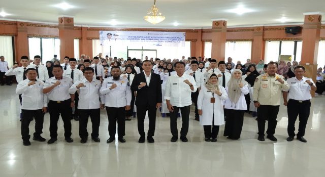 Ogan Komering Ilir, Sumsel9.com — Kabupaten Ogan Komering Ilir (OKI) menjadi daerah tercepat di Provinsi Sumatera Selatan dalam penyerahan Surat Keputusan (SK) Calon Pegawai Negeri Sipil (CPNS) formasi tahun 2024. Acara penyerahan SK CPNS ini digelar pada hari Rabu, (16/4/25), bertempat di Kantor Bupati OKI dan diserahkan langsung oleh Bupati OKI, H. Muchendi Mahzareki, didampingi Asisten serta Kepala OPD di Lingkungan Pemkab OKI dan juga para keluarga CPNS yang tampak antusias dan bahagia. Bupati OKI H. Muchendi menyampaikan rasa bangga atas keberhasilan Pemkab OKI menjadi yang pertama menyerahkan SK CPNS tahun ini.