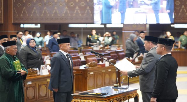 Palembang, Sumsel9.com – DPRD Prov.Sumsel menggelar Rapat Paripurna XIX (19) dengan agenda pengucapan sumpah/janji pengganti antar waktu (PAW) anggota DPRD Prov.Sumsel An. Ganjar Iman, SH.,MH dipimpin oleh Ketua DPRD Prov.Sumsel Andie Dinialdie, SE, MM didampingi oleh para Wakil Ketua DPRD Prov.Sumsel; Raden Gempita, SH, H. Nopianto, S.Sos, MM, dan H.M. Ilyas Panji Alam, S.E., S.H., M.M, dihadiri oleh Wakil Gubernur; H. Cik Ujang ,SH, Sekretaris Daerah; Drs. H. Edward Chandra, MH, Sekretaris DPRD; H. Aprizal, S.Ag, SE, M.Si, Para Kepala Dinas serta perwakilan Organisasi Perangkat Daerah (OPD) di lingkungan Pemerintah Prov.Sumsel serta tamu undangan lainnya.