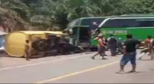 Bus pariwisata hijau bertuliskan Alexa Wisata (BH 7795 FU) yang melaju dari arah Palembang menuju Jambi bertabrakan dengan truk tangki kuning bertuliskan Gacur Team Jalur Langit (BG 8606 JL) dari arah berlawanan. Truk tersebut diketahui mengangkut muatan diduga BBM jenis solar.